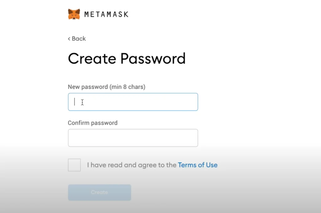In seguito, MetaMask vi chiederà di creare una password. Nota che questa è la password per il tuo account MetaMask e quindi non è la stessa delle chiavi private o di recupero del tuo portafoglio.