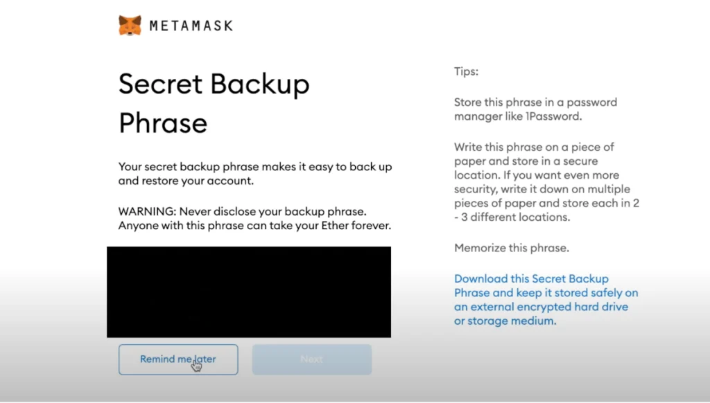 Successivamente, verrai portato alla pagina “Frase di sicurezza di backup”, dove ti verrà data la frase di recupero di 12 parole per il tuo portafoglio.