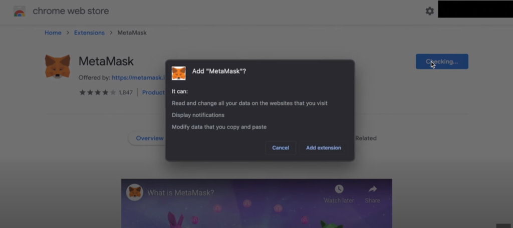 Questo ti porterà al Chrome web store. Dopo aver premuto il pulsante “Add to Chrome”, apparirà una notifica push. Una volta cliccato su “Aggiungi estensione”, MetaMask inizierà il download.